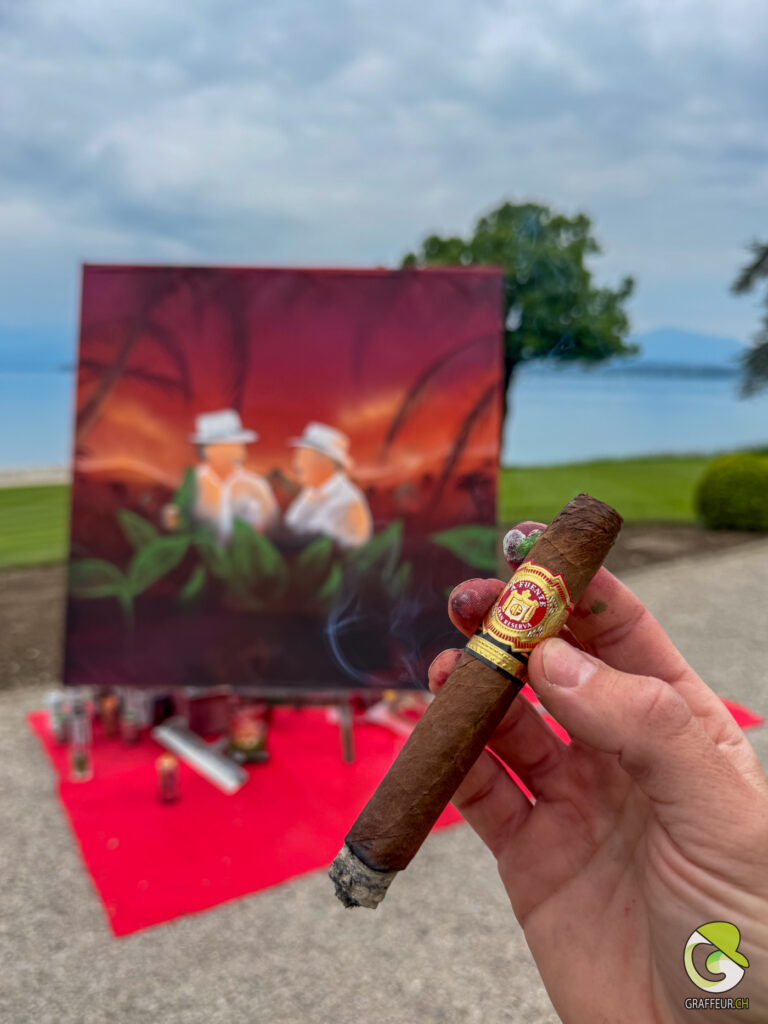 Pour l’événement exclusif de La Couronne SA au Golf Club Impérial de Gland, nous avons proposé une prestation de live painting unique. Réalisée en direct, cette œuvre a été créée à l’aide de spray et pochoir sur un format 180×180 cm, représentant l’univers raffiné et luxueux des cigares Arturo Fuente.