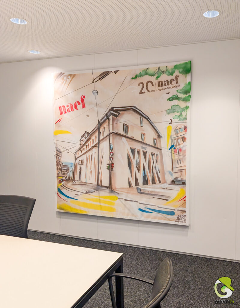 Après la soirée, le tableau a été livré et installé directement dans les bureaux de l’agence Naef à Neuchâtel, où il témoigne désormais de cet anniversaire marquant.