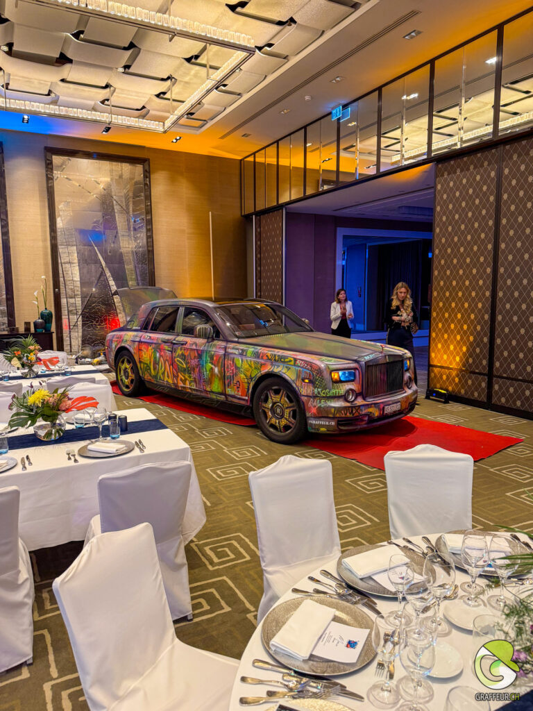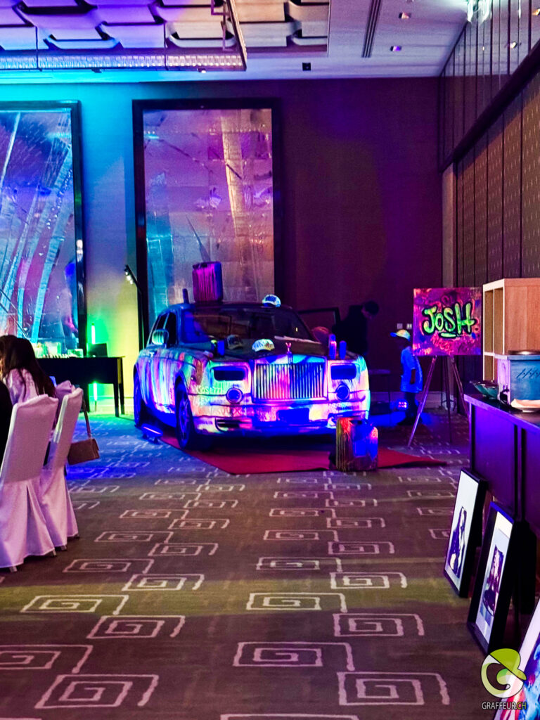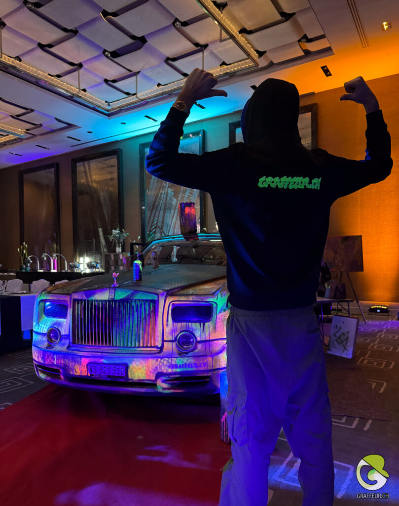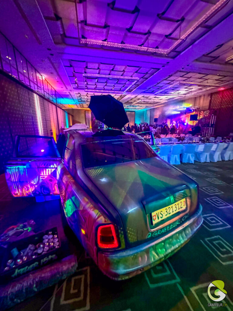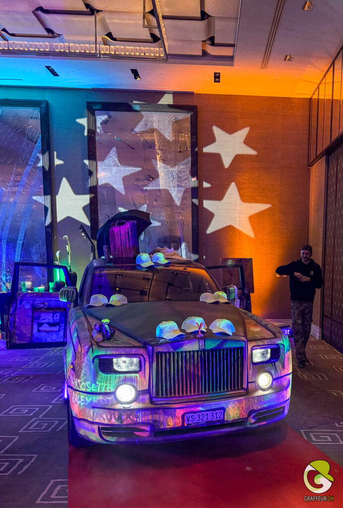L’Intercontinental de Genève a accueilli une Bar Mitzvah inédite, animé en partie par Graffeur.ch. L’élément phare : une Rolls Royce graffée en couleurs fluo, éclairée par des lumières UV pour un effet spectaculaire. Cette œuvre d’art a transformé la salle en une scène urbaine unique.
