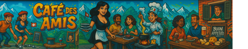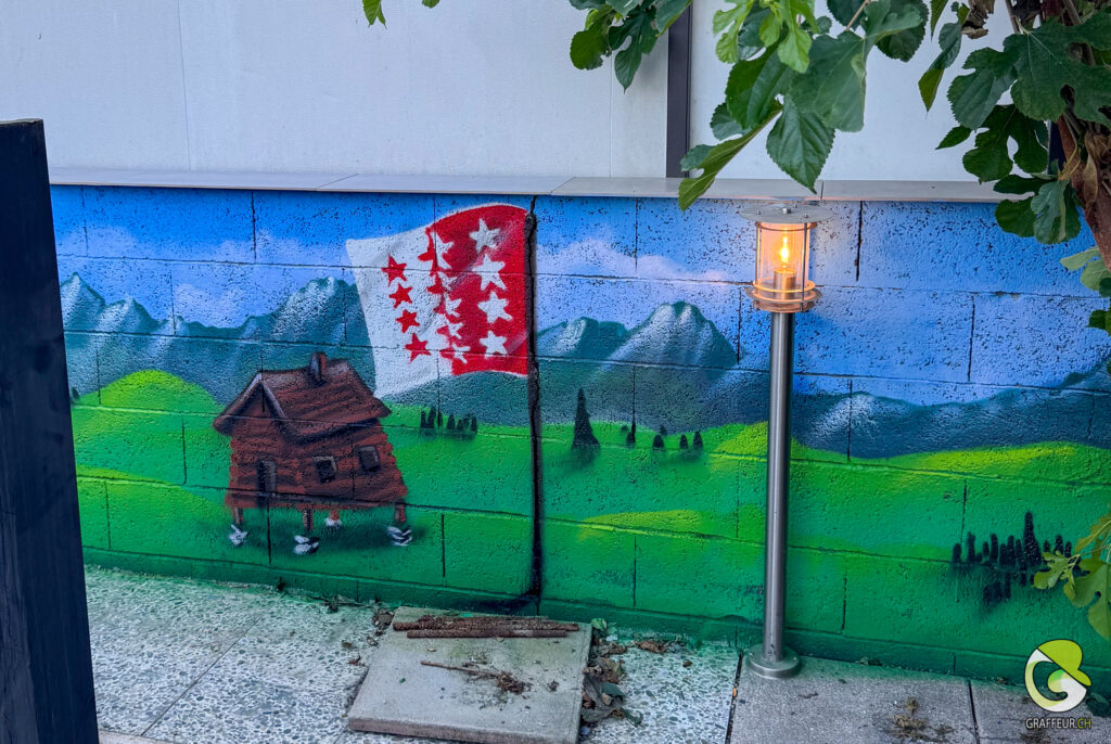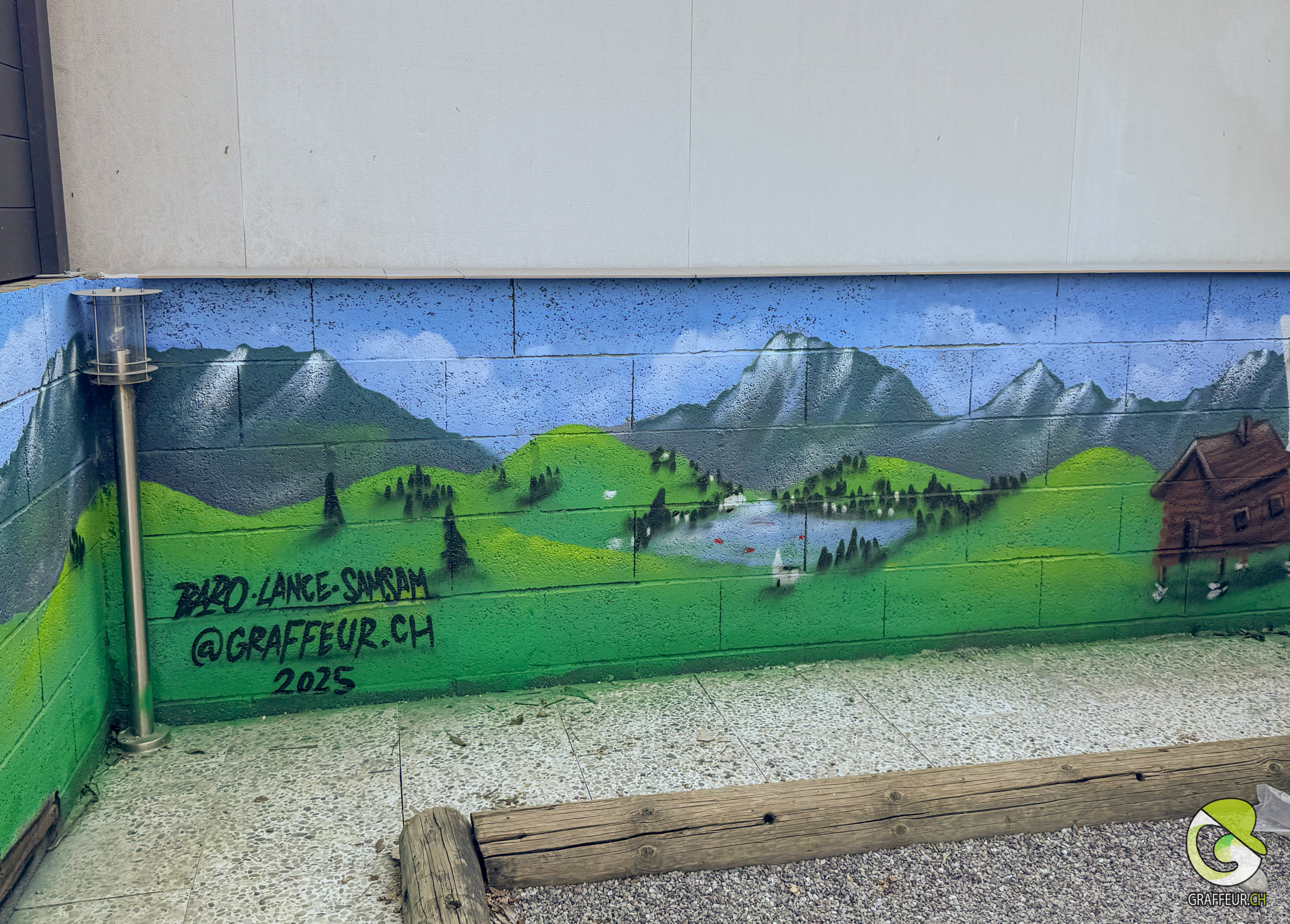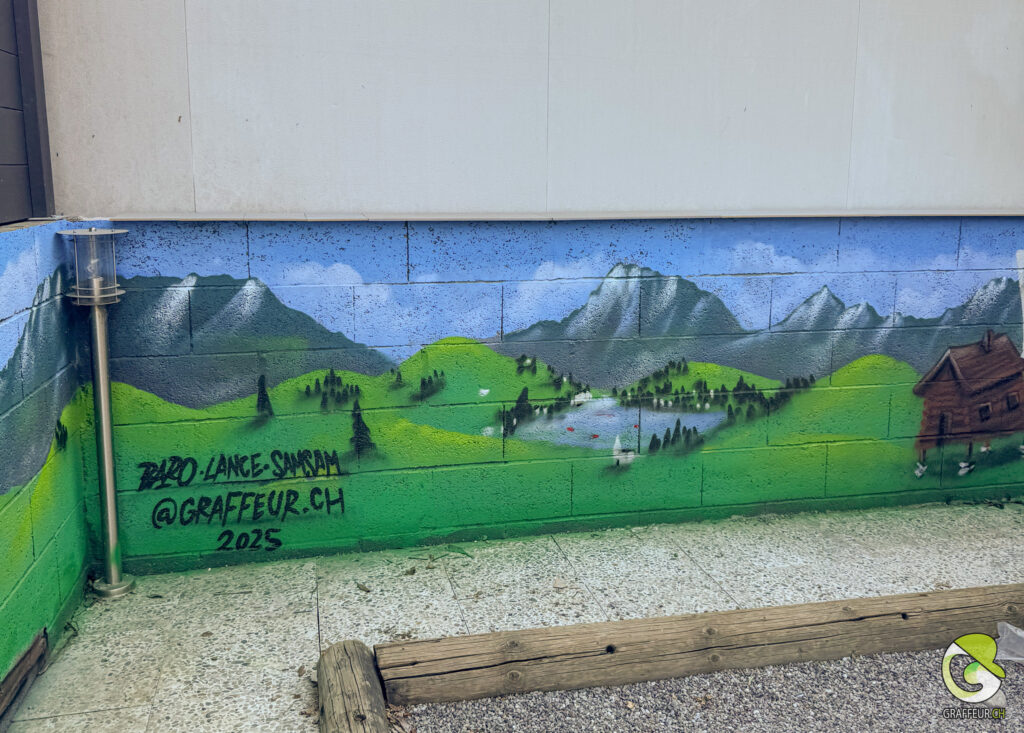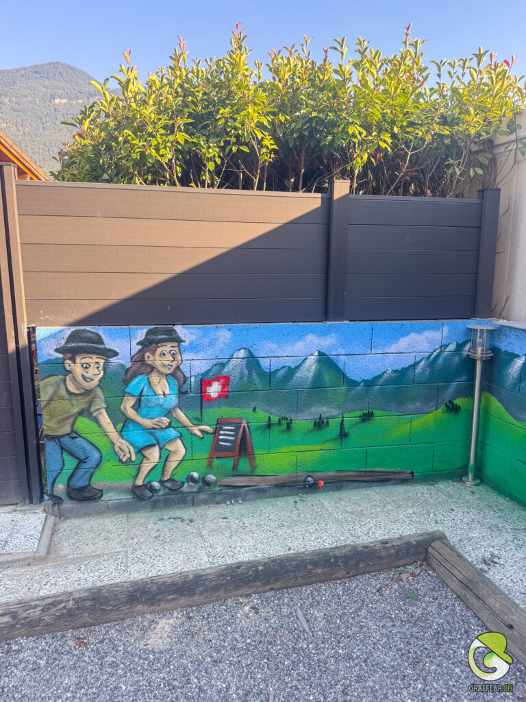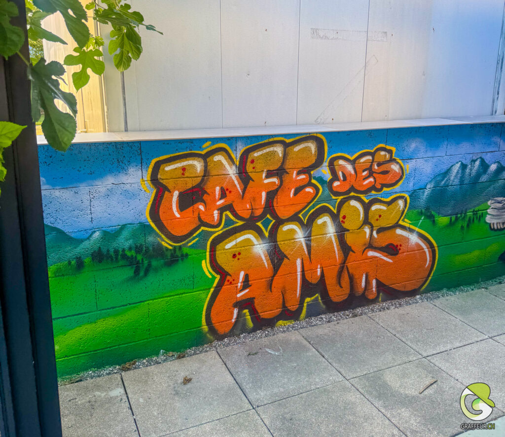 Graffeur.ch a réalisé une fresque à la bombe sur le mur de la terrasse du Café des Amis à Fully. Le décor met en valeur le paysage typique du Valais, accompagné d’une représentation de la serveuse et des clients, inspirée d’un avant-projet fourni par le client qu’il a crée avec l’IA ( Intelligence Artificielle)