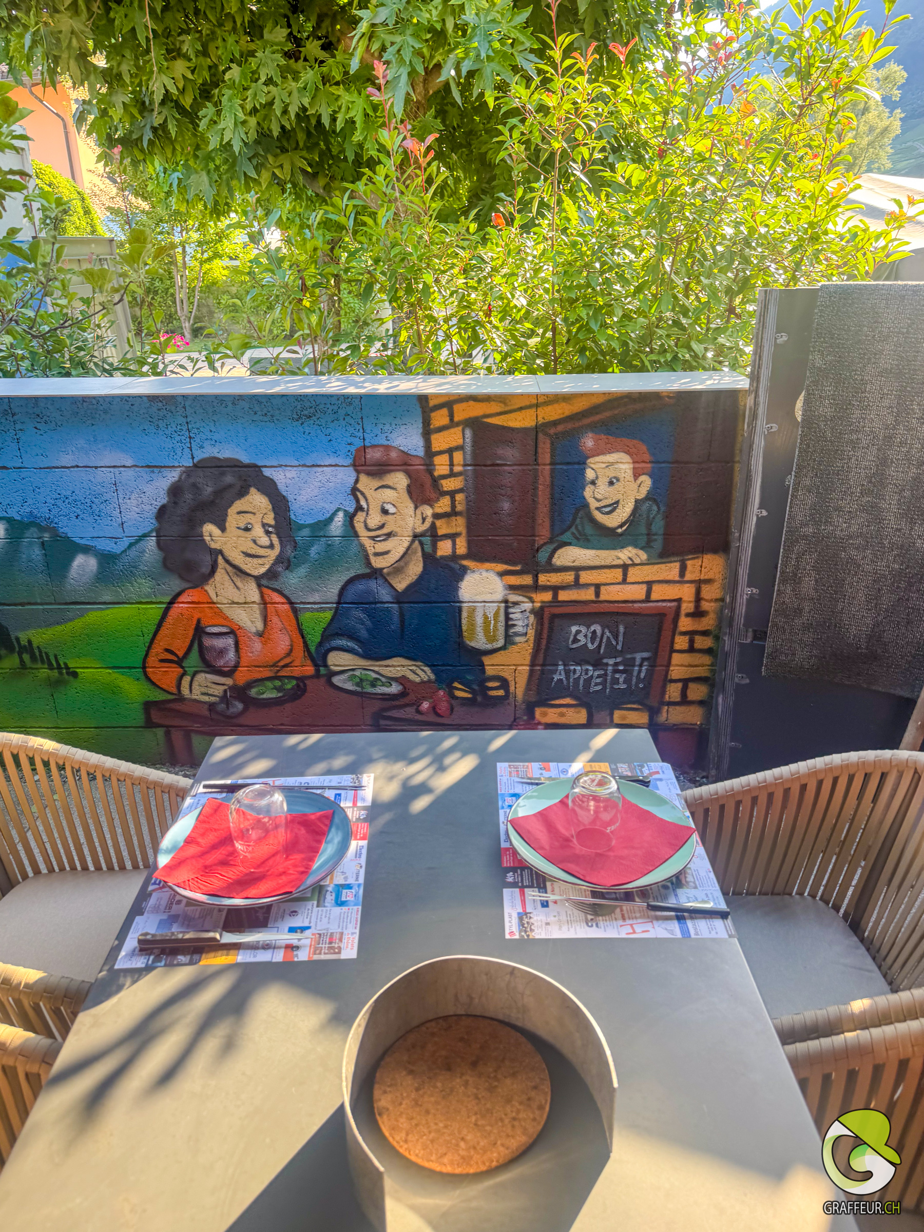 Tags SEO : graffiti mural Valais, fresque terrasse restaurant, décoration murale Fully, peinture à la bombe café, art mural personnalisé, ambiance conviviale restaurant.