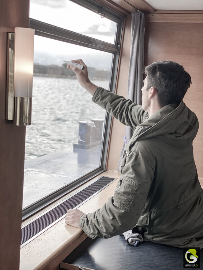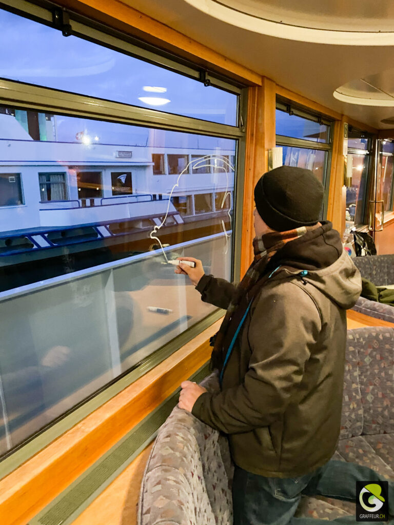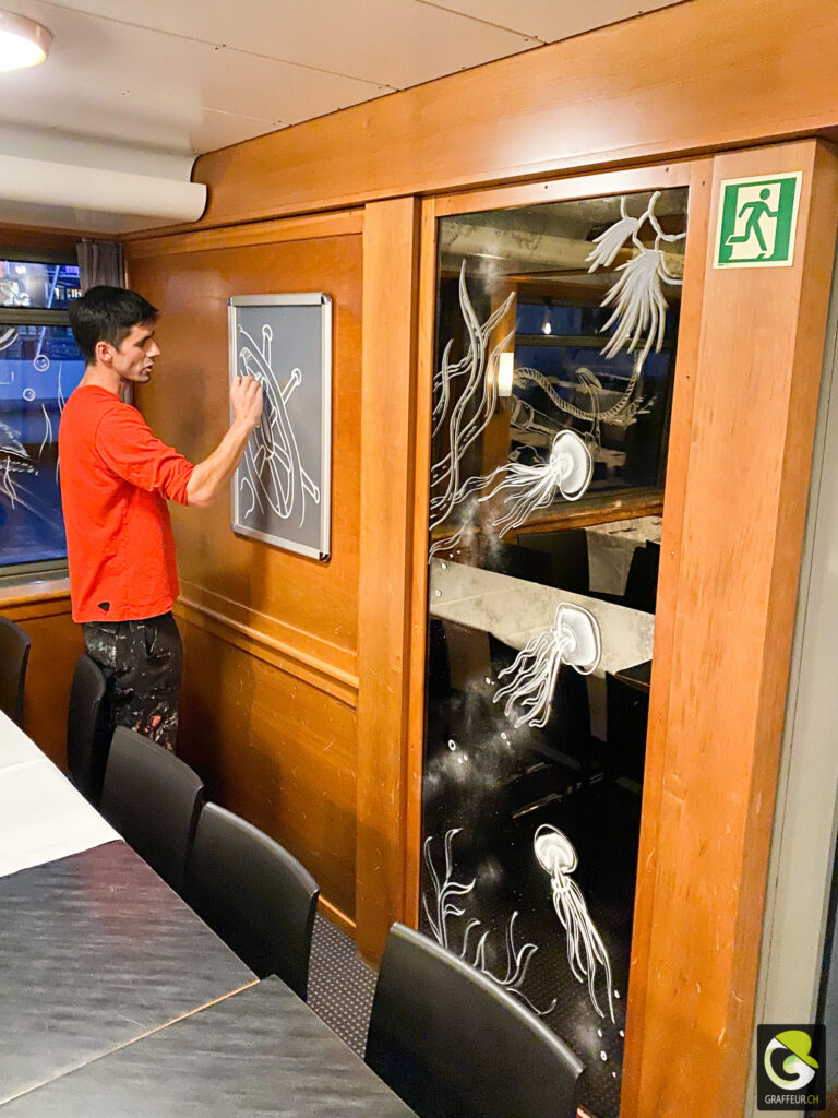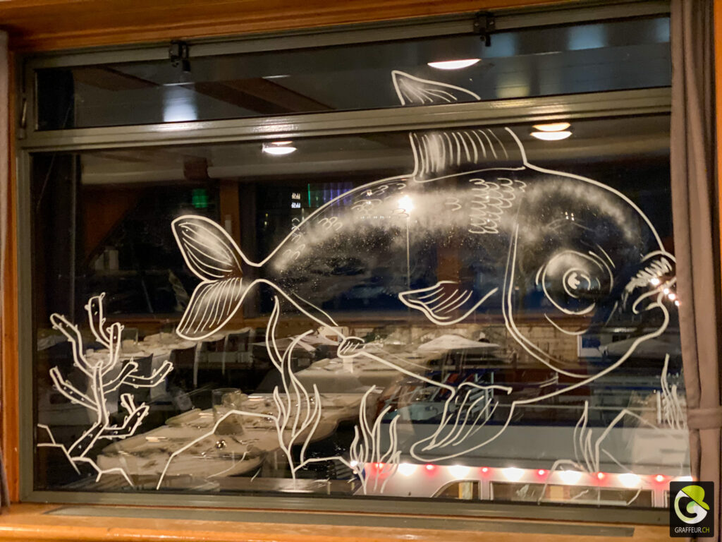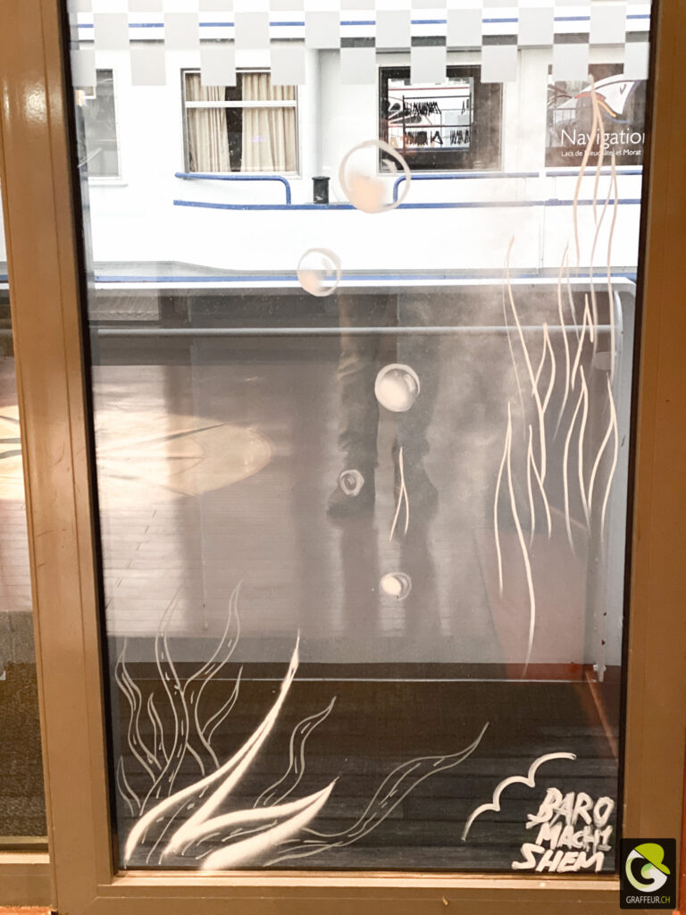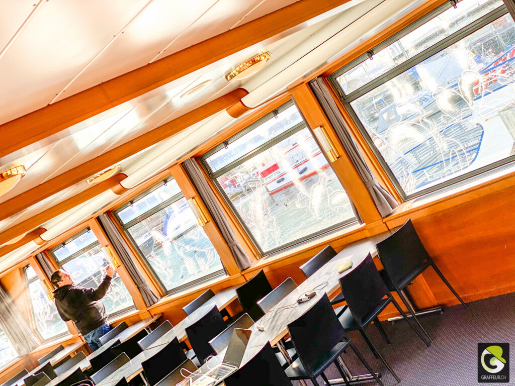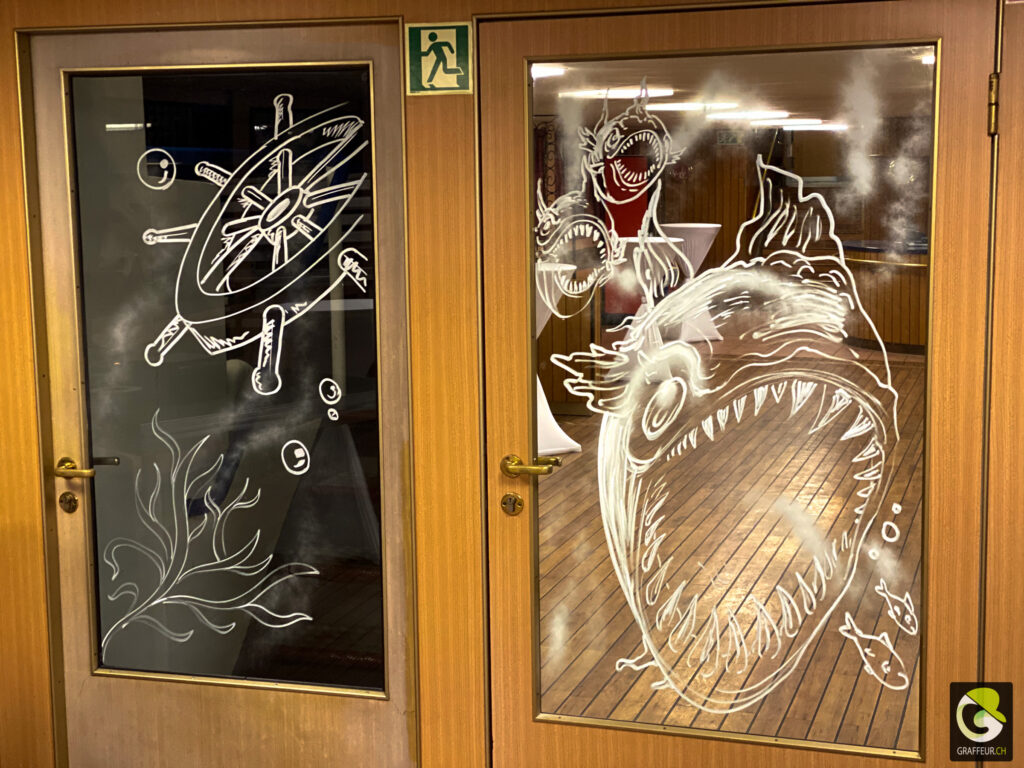 Décoration des vitres de deux bateaux du lac de Neuch pour une soirée de boite horlogère. Avec les collègues Shem et Ludo