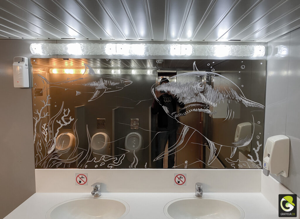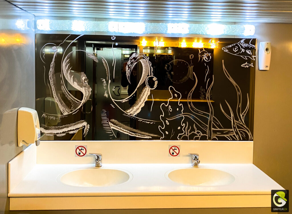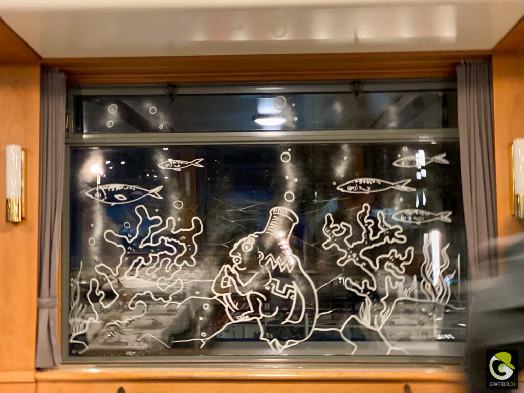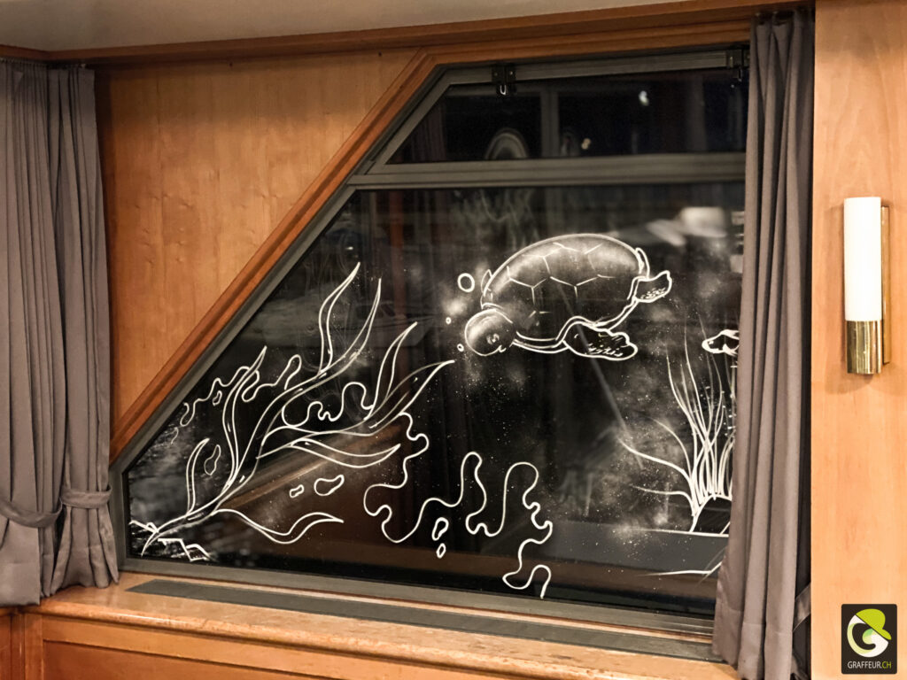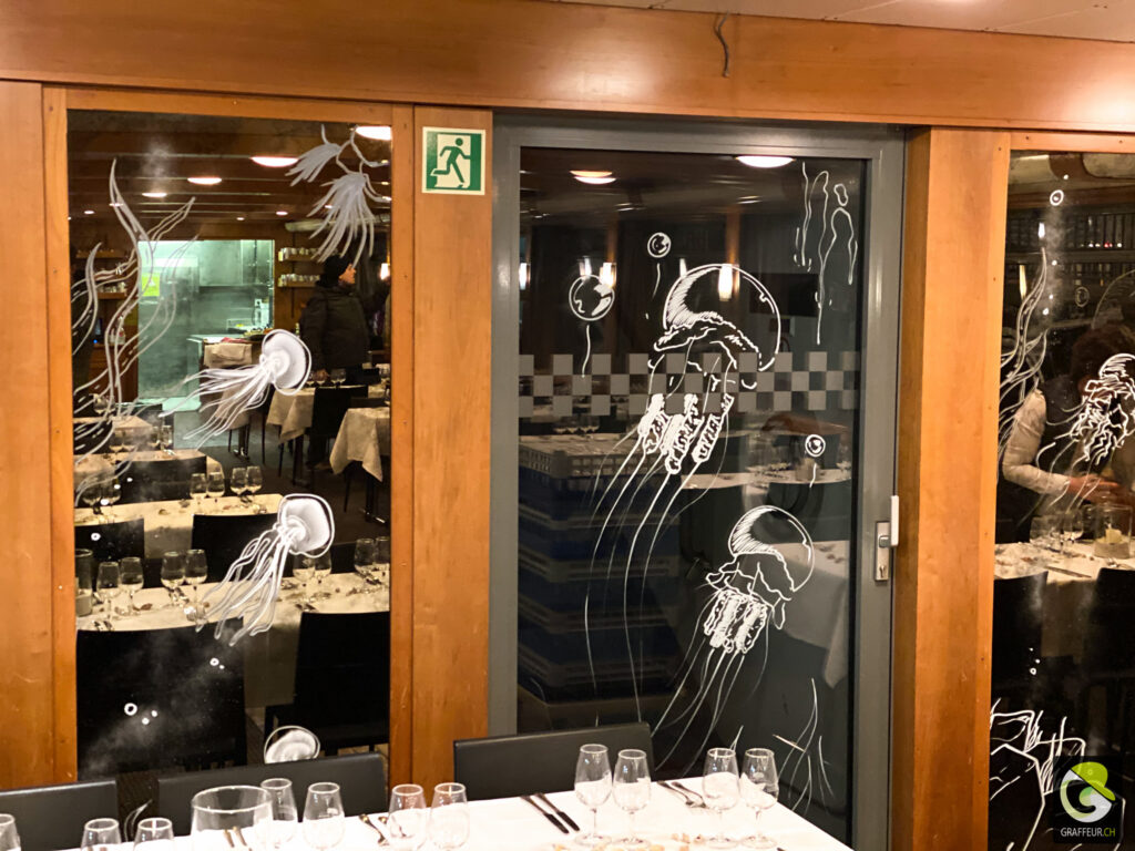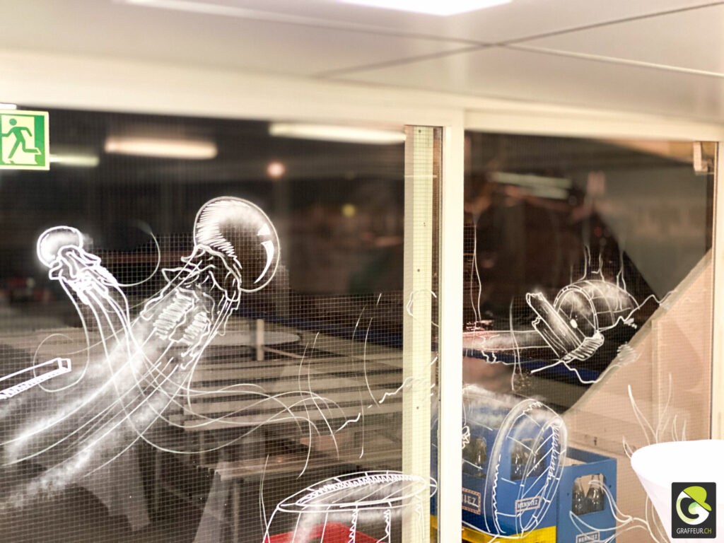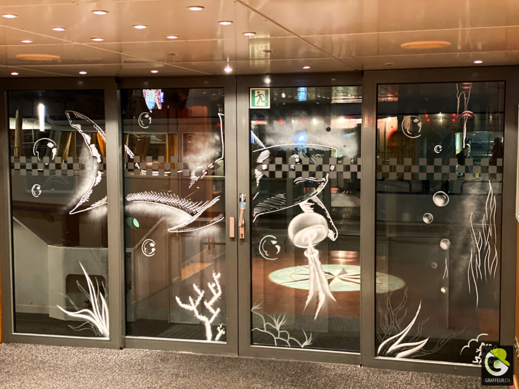 Décoration des vitres de deux bateaux du lac de Neuch pour une soirée de boite horlogère. Avec les collègues Shem et Ludo