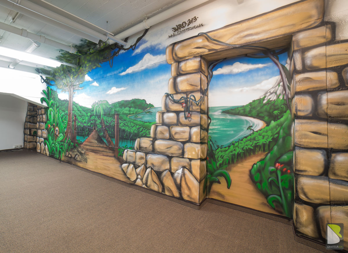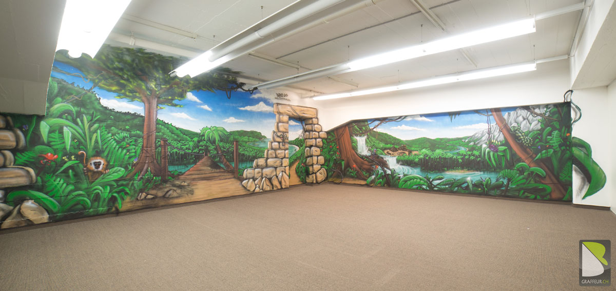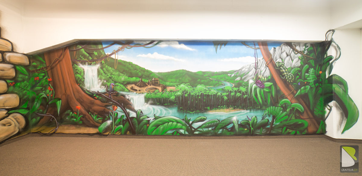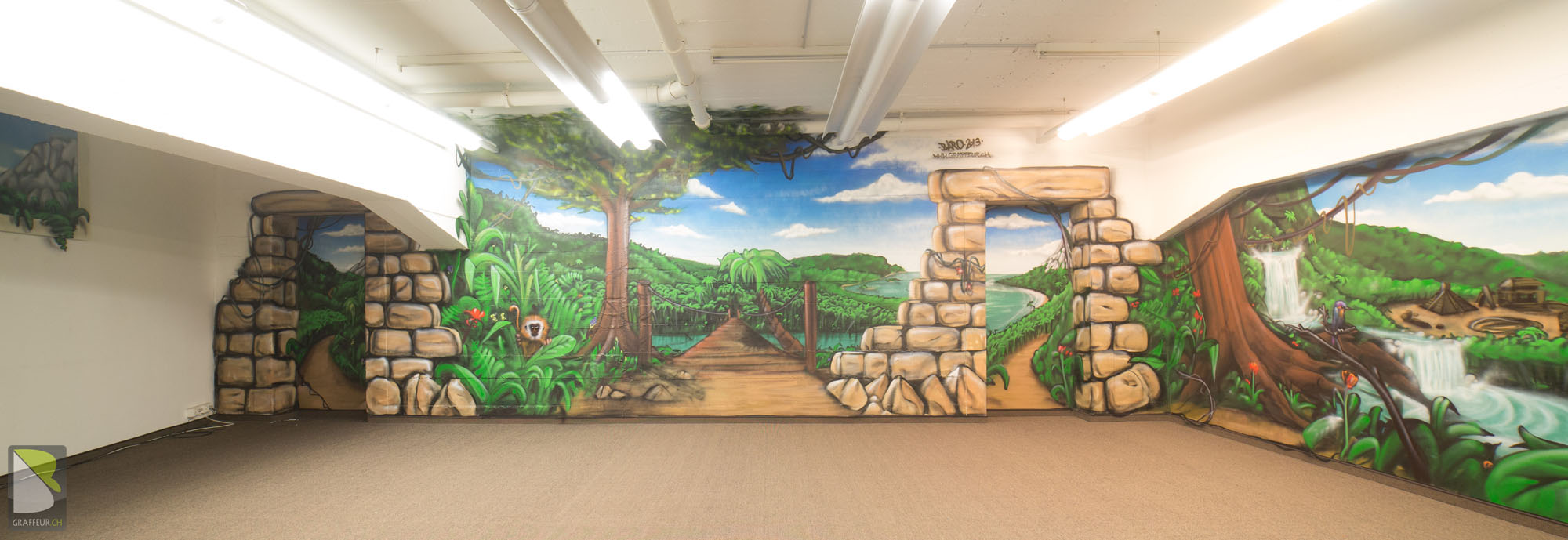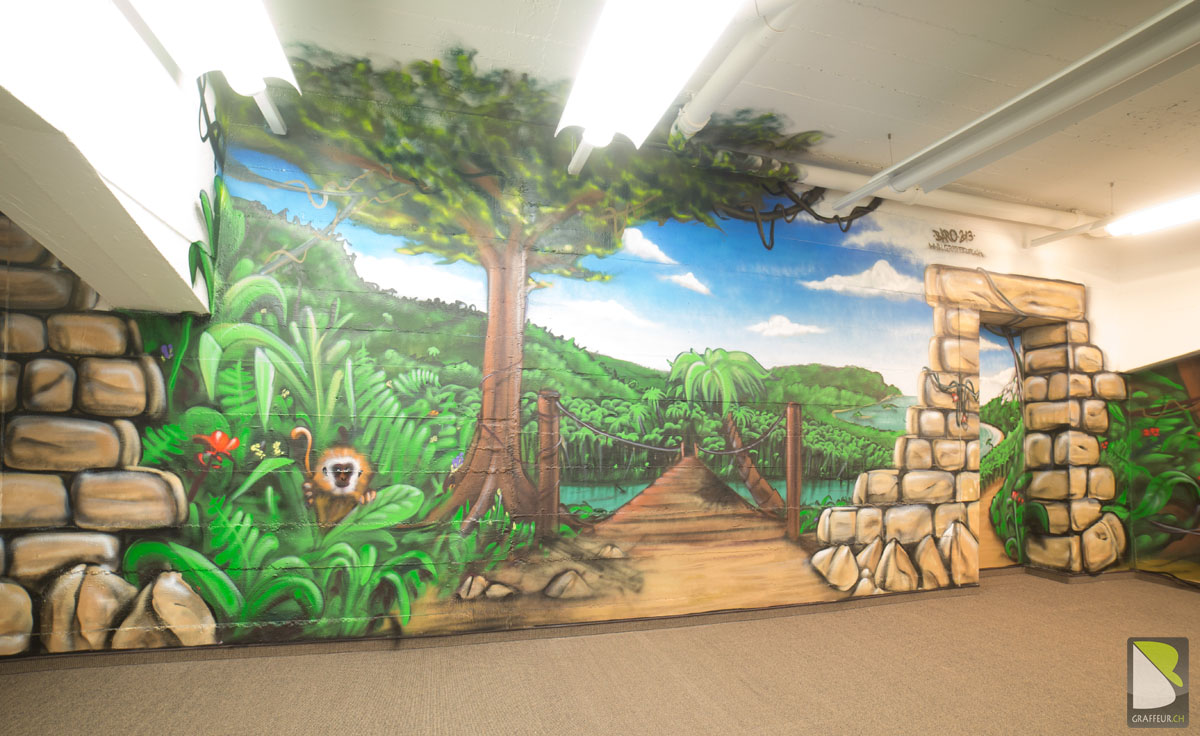 Décoration de la salle de Repos d’une entreprise à Lausanne : un trompe-l’oeil avec une ambiance Jungle : Un Caméléon, un Martin pecheur et un Singe.